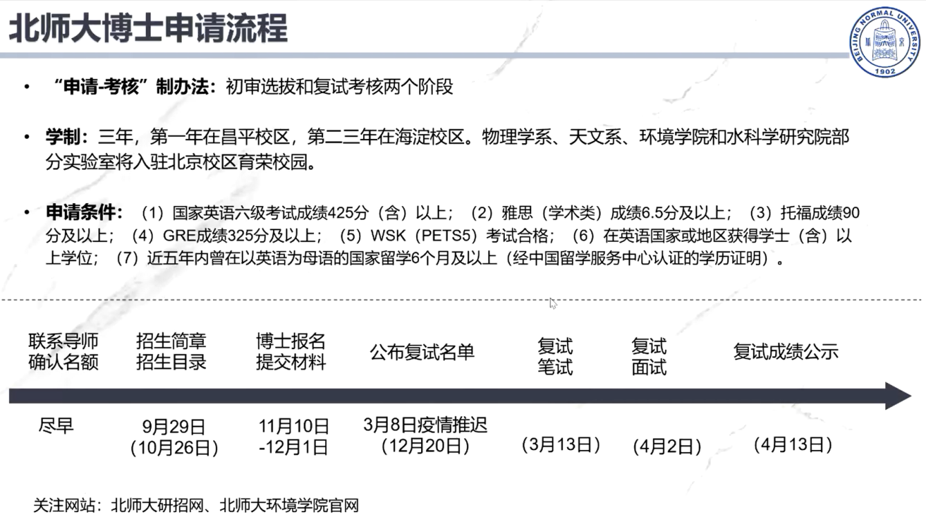 第一位给我们带来分享的是张梦淇师姐,为我们介绍了北师大本校申博的经验。首先为我们介绍了北师大博士申请流程,强调了申请过程的几个重要的时间节点,其中联系导师的时间要尽早;申请办法采用“申请-考核”制办法,有初审和复试两个环节,并注明了一些申请的硬性条件,例如需要通过英语六级等;