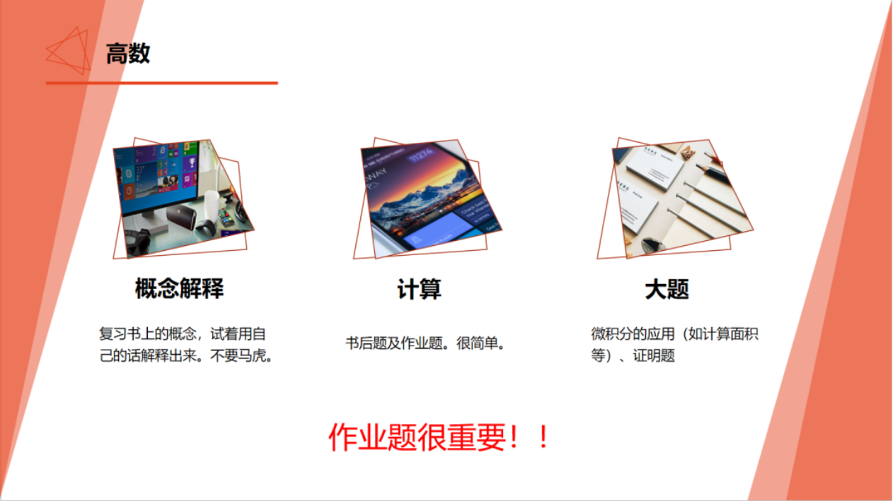 在复习建议中他提到复习材料可以选择教材、课件和作业等:大学的考试与高中不同,考试更多的是考察你是否掌握了这个知识;重点都在课上老师强调的内容里。
